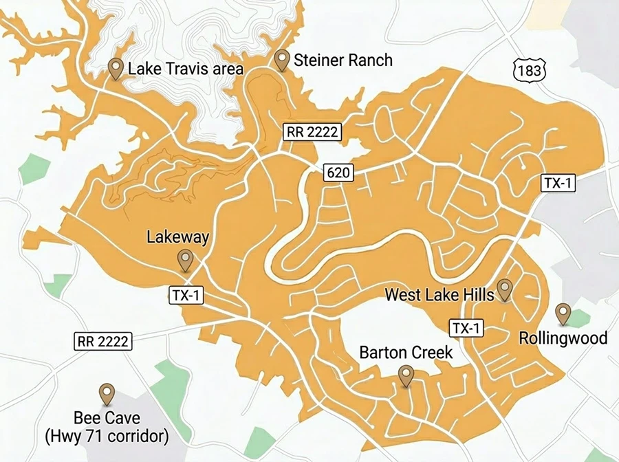 Westlake Hills and Bee Cave make up one of the highest-income commercial corridors in the Austin metro area. Along Highway 71, communities like Lakeway and Steiner Ranch have seen rapid growth in medical offices, financial services firms, and upscale retail, all of which expect a consistently exceptional level of cleanliness.